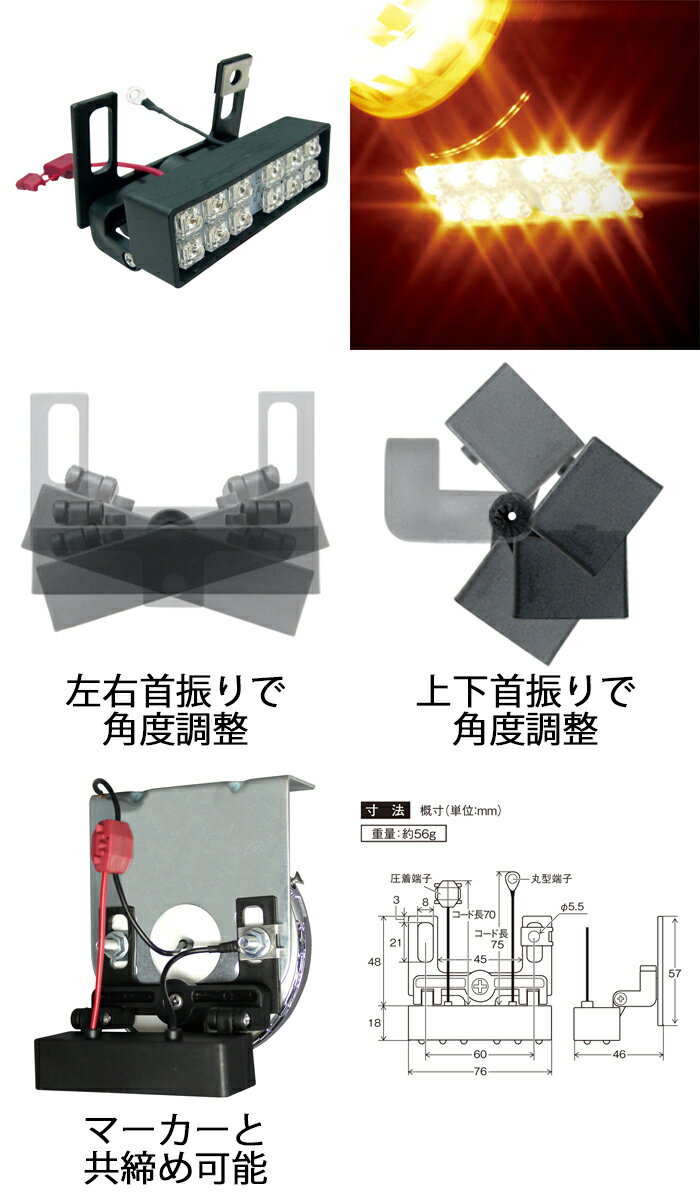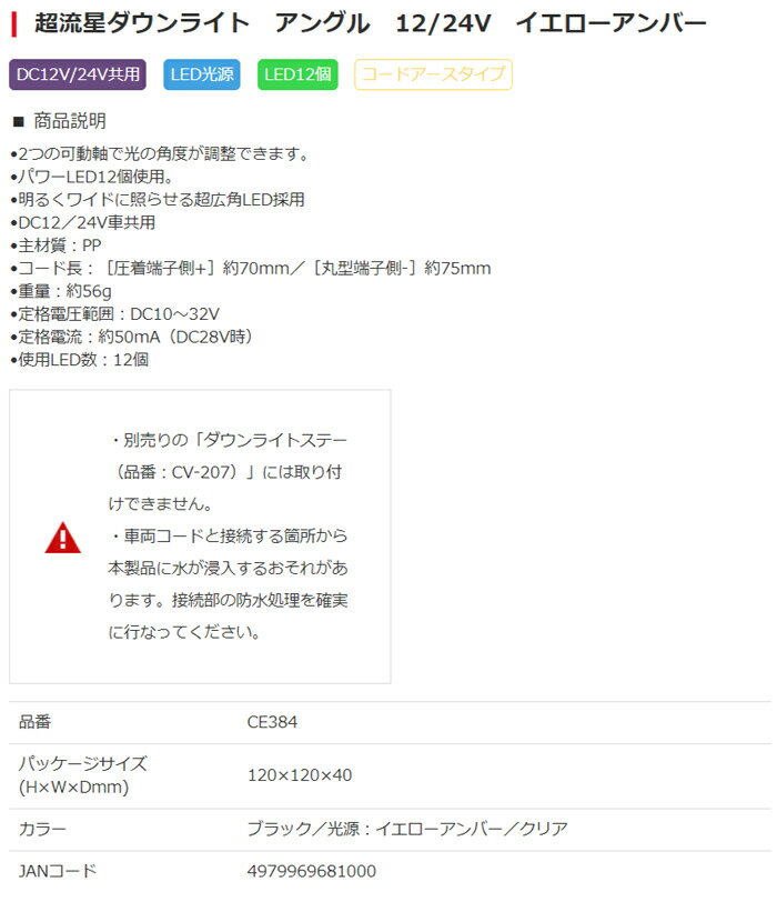 ■明るくワイドに照らせる超広角LED採用 ■DC12/24V車共用 ■主材質:PP ■コード長:[圧着端子側+]約70mm/[丸型端子側-]約75mm ■重量:約56g ■定格電圧範囲:DC10〜32V ■定格電流:約50mA(DC28V時) ■使用LED数:12個 ■カラー:ブラック/光源:イエローアンバー/クリア ※別売りの「ダウンライトステー(品番:CV-207)」には取り付けできません。